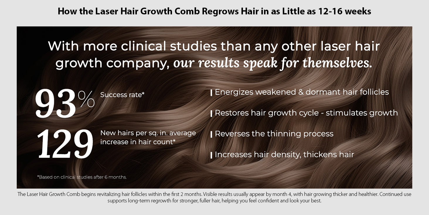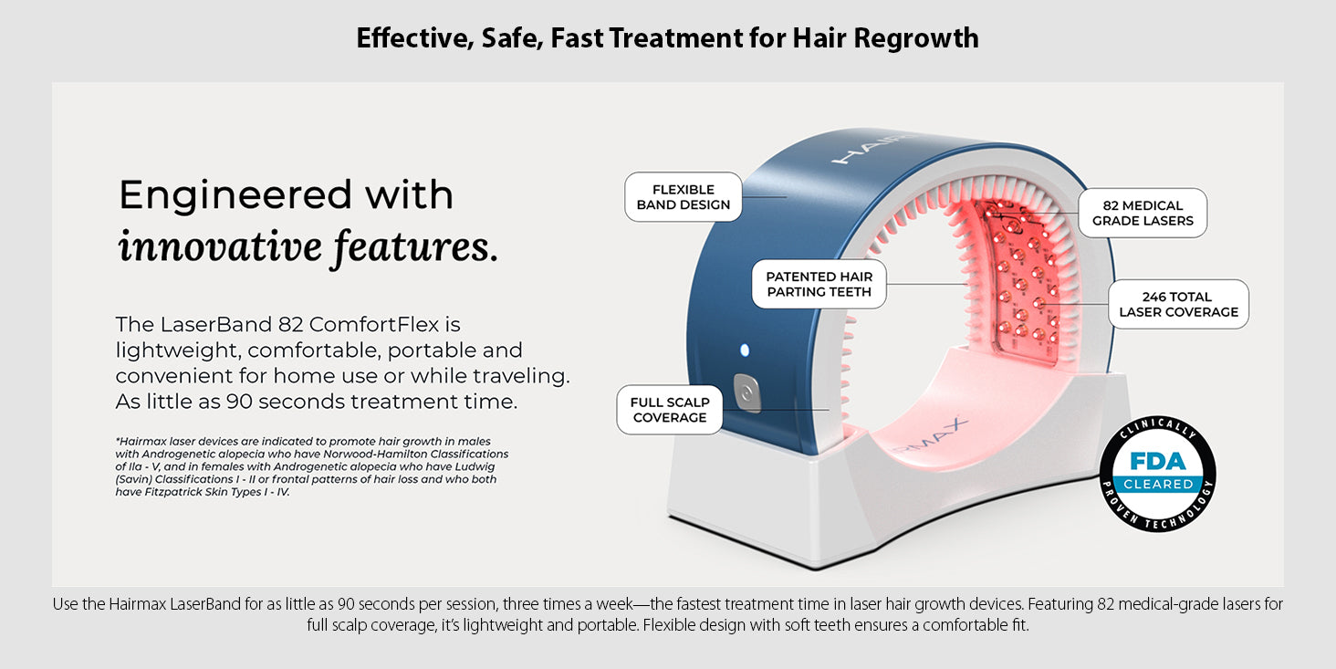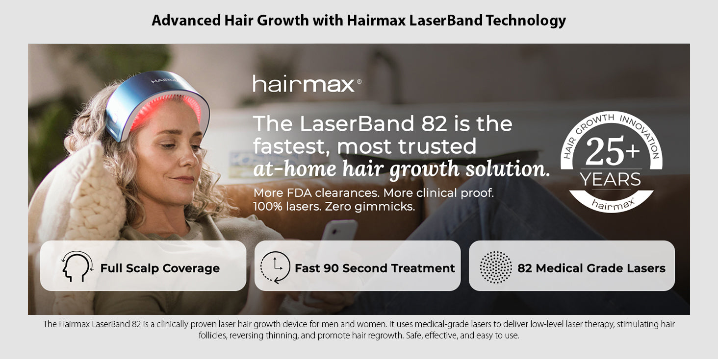 Embark on a revolutionary hair regrowth journey with the LaserBand 82. Boasting a flexible band design, soft-touch hair-parting teeth, and 82 medical-grade lasers, it offers full scalp coverage, equivalent to 246 total lasers. This powerhouse device targets hair loss by delivering focused laser energy to your follicles. Witness unparalleled hair growth with just three weekly treatments, each lasting as little as 90 seconds!