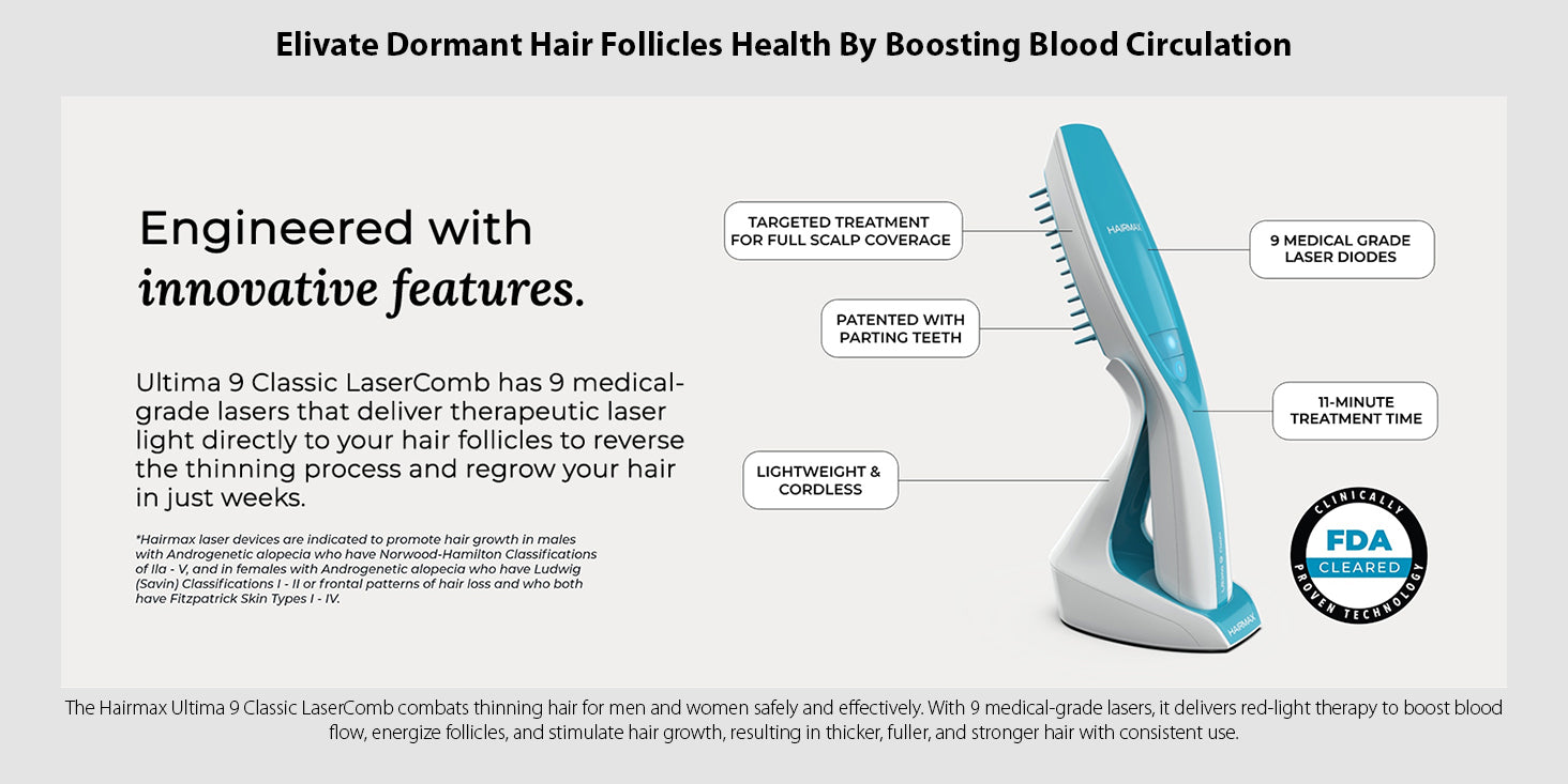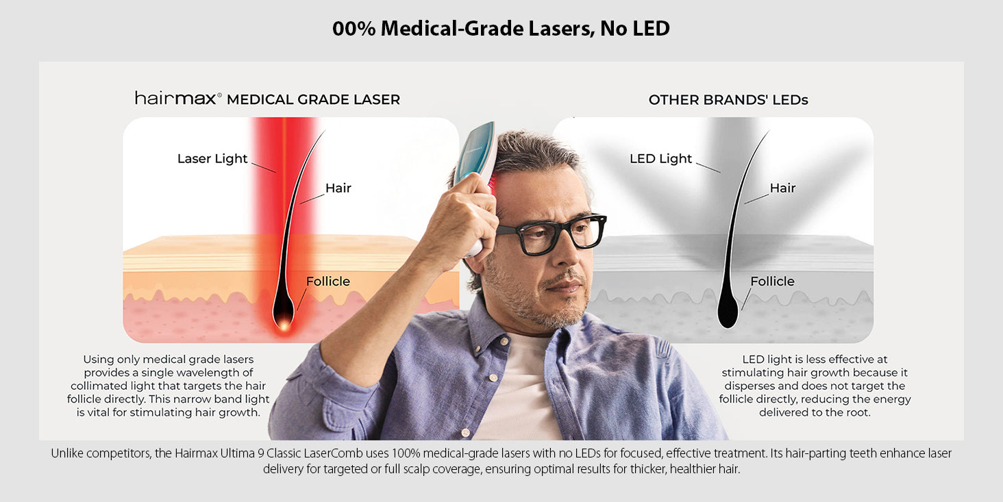 Experience the transformative power of the Ultima 12 Classic LaserComb. With its 12 medical-grade lasers, this home-use medical device delivers therapeutic laser light to your hair follicles to treat hair loss, reverse thinning, restore your hair growth cycle, increase density and fullness, and revitalize damaged hair.