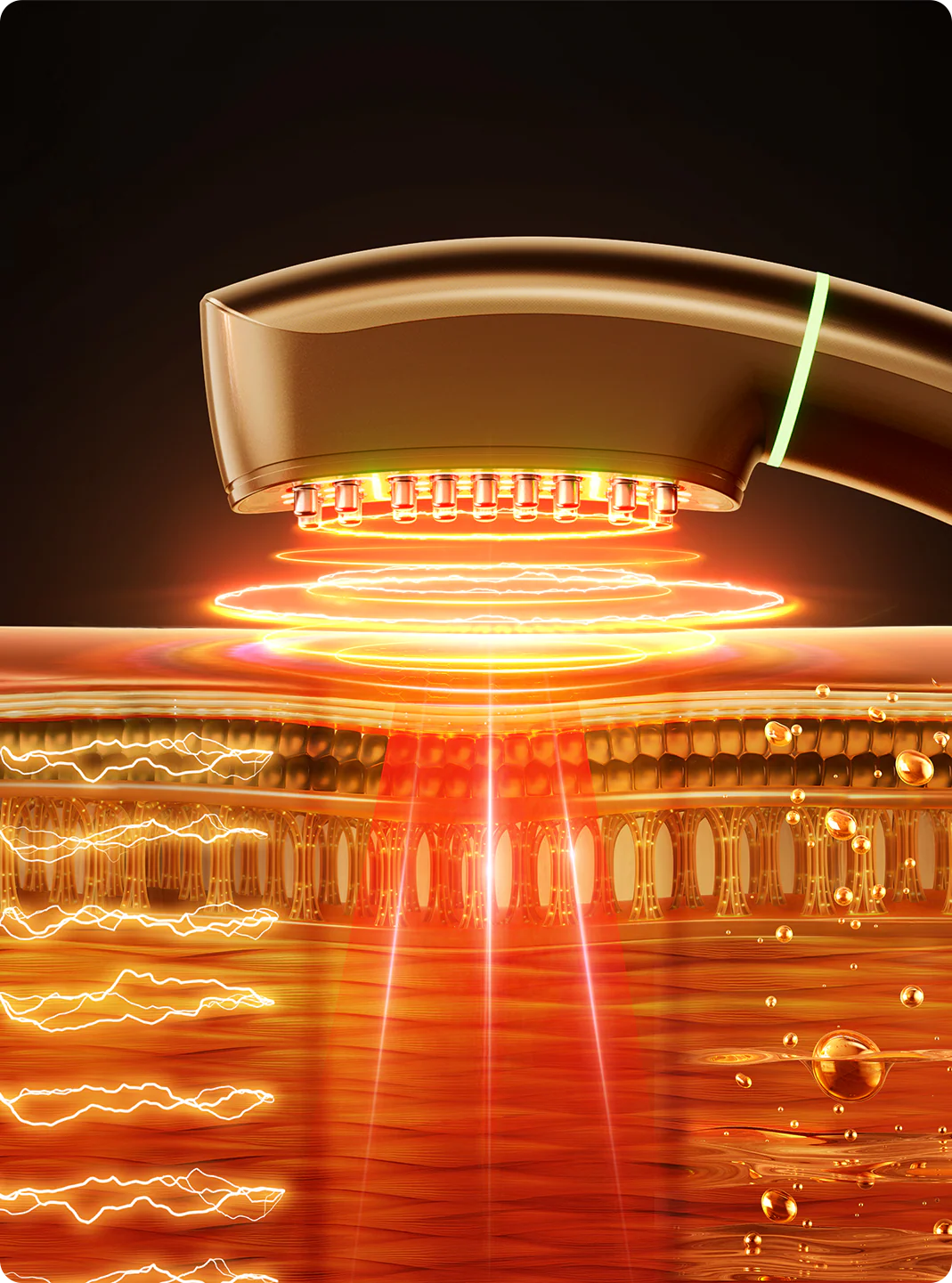 تقنية HIFES لشد ونحت البشرة، والأضواء الحمراء والخضراء لتجديدها، والمكونات النشطة المعززة للكولاجين لتماسك الجلد من الداخل — لنتائج واضحة وسريعة